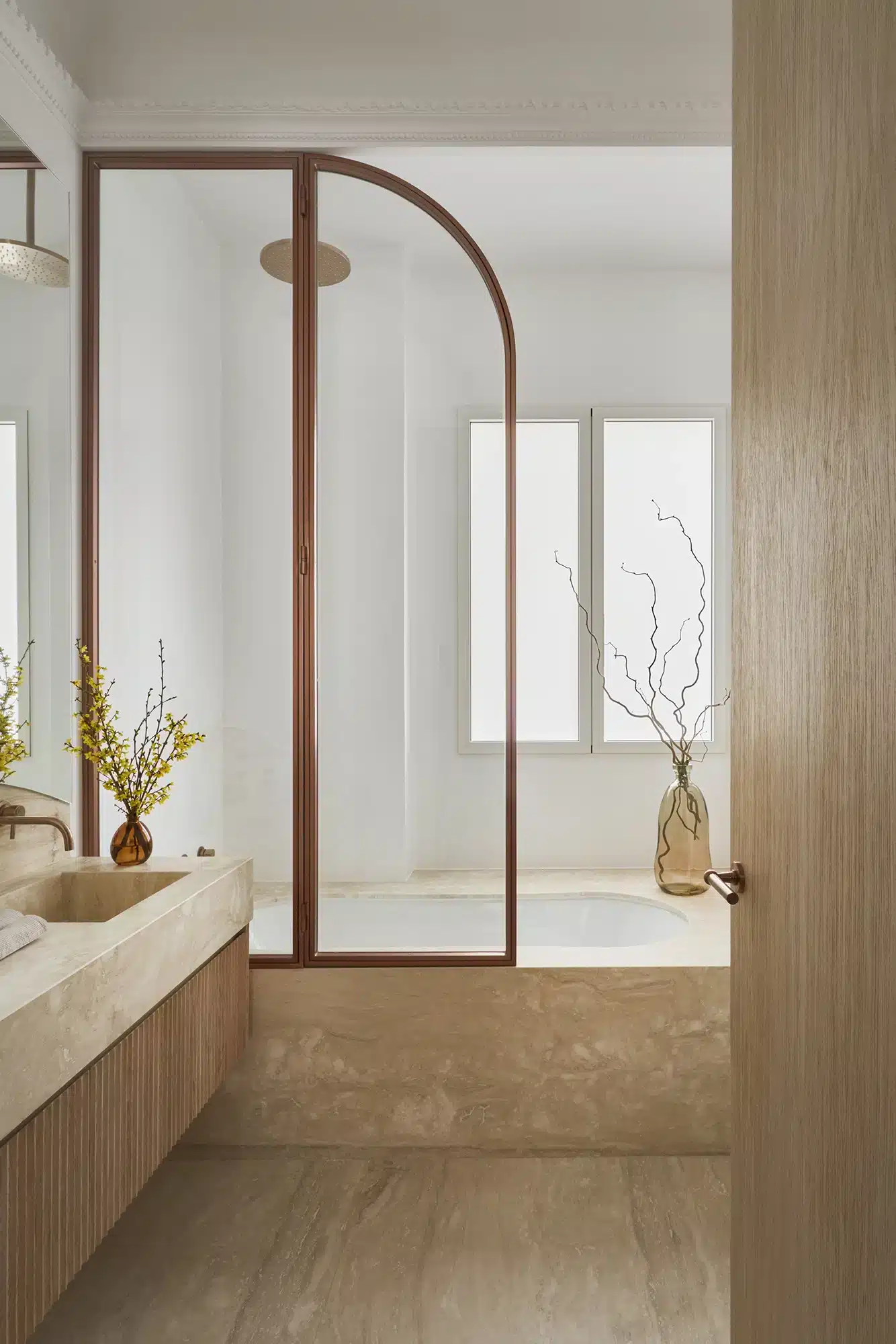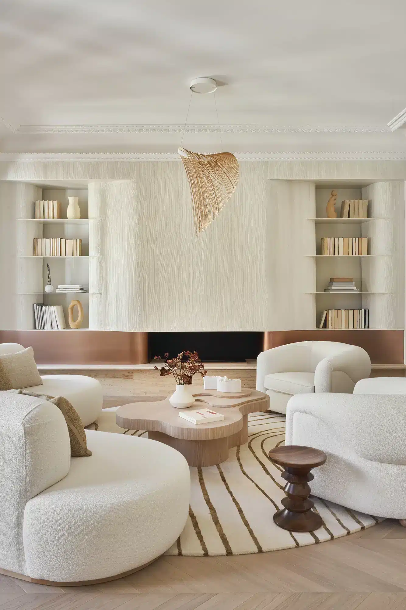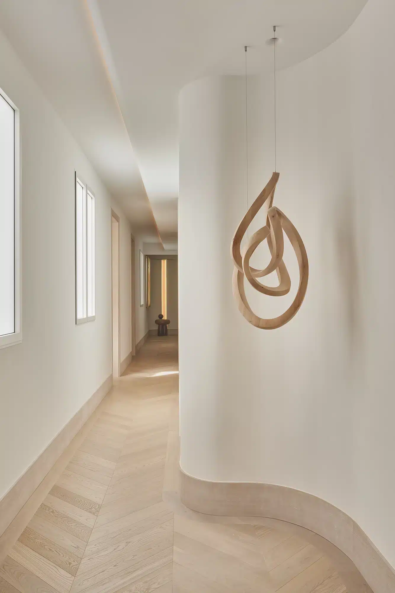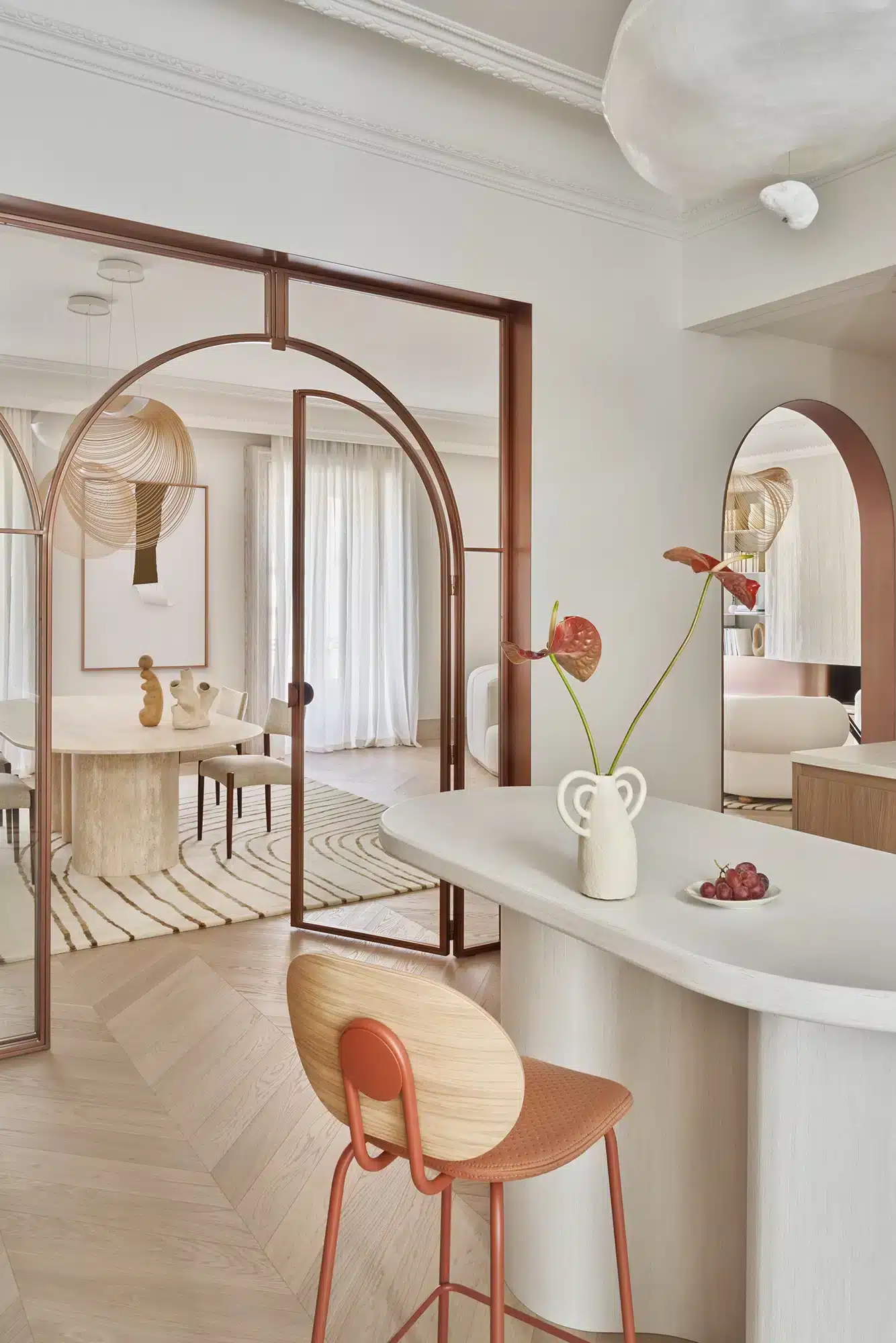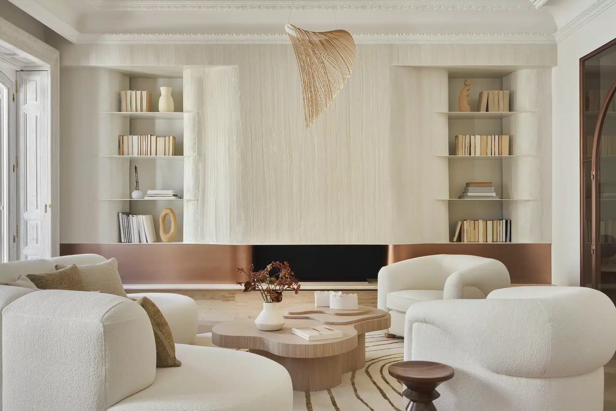“Emoción Contenida. El “menos es más” también tiene su lado apasionante, como demuestra la reforma de este piso en el barrio señorial de Salamanca, en Madrid. Zinc Arquitectos trae al presente lo mejor del pasado acudiendo a los materiales nobles, las formas sinuosas y los colores terrosos”