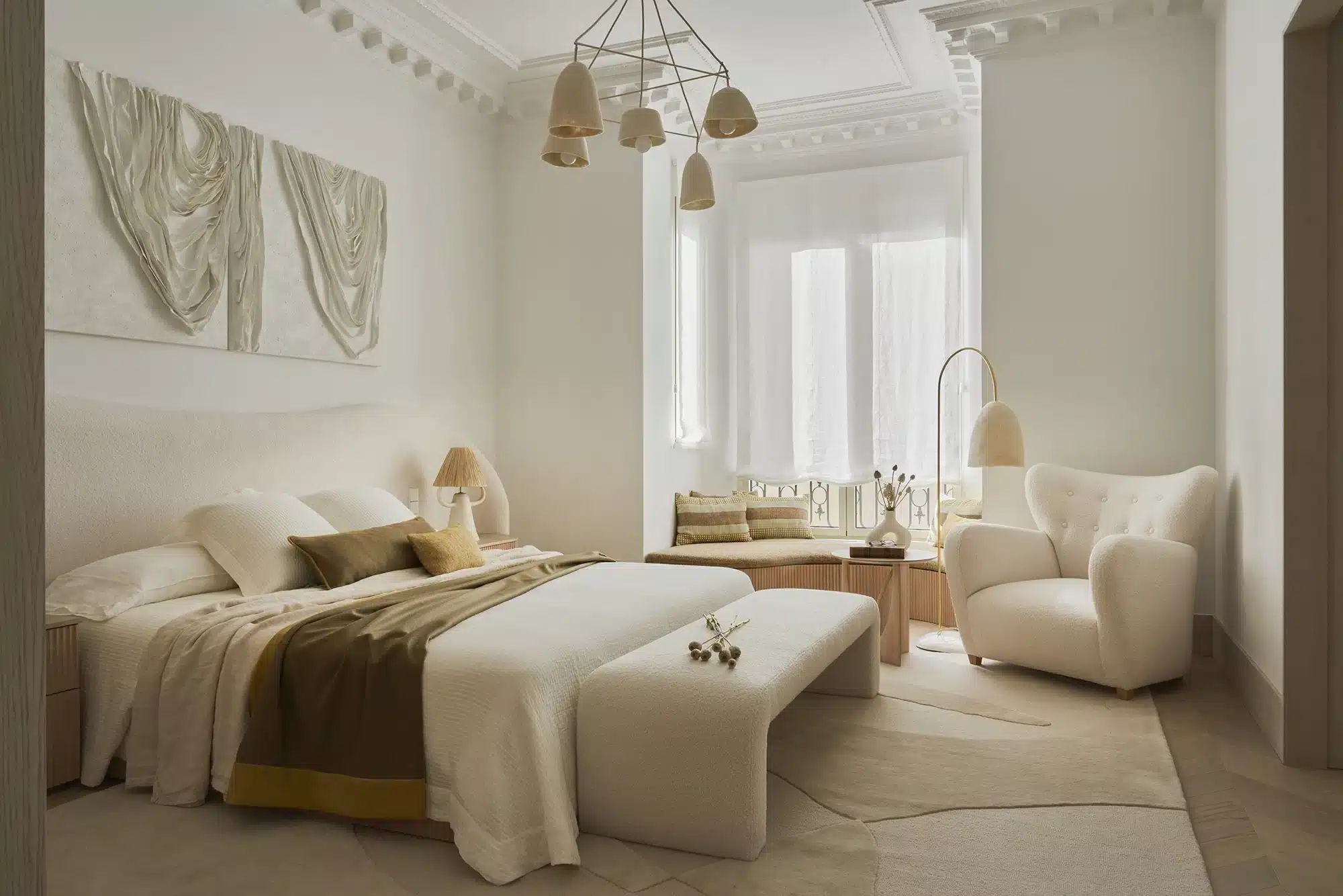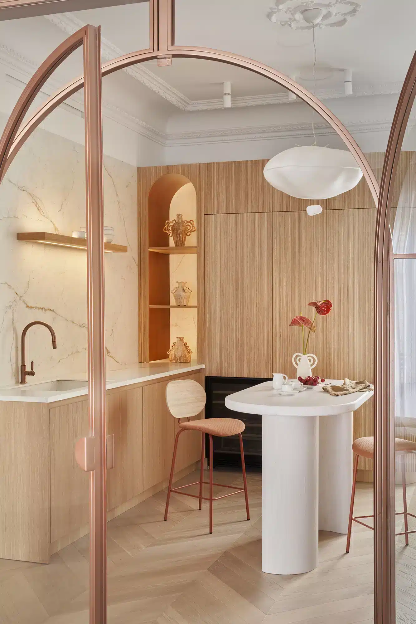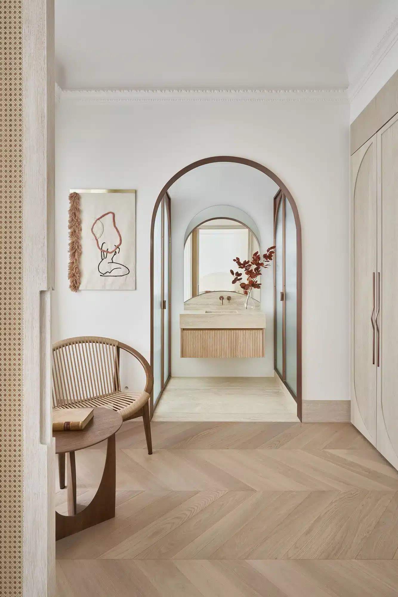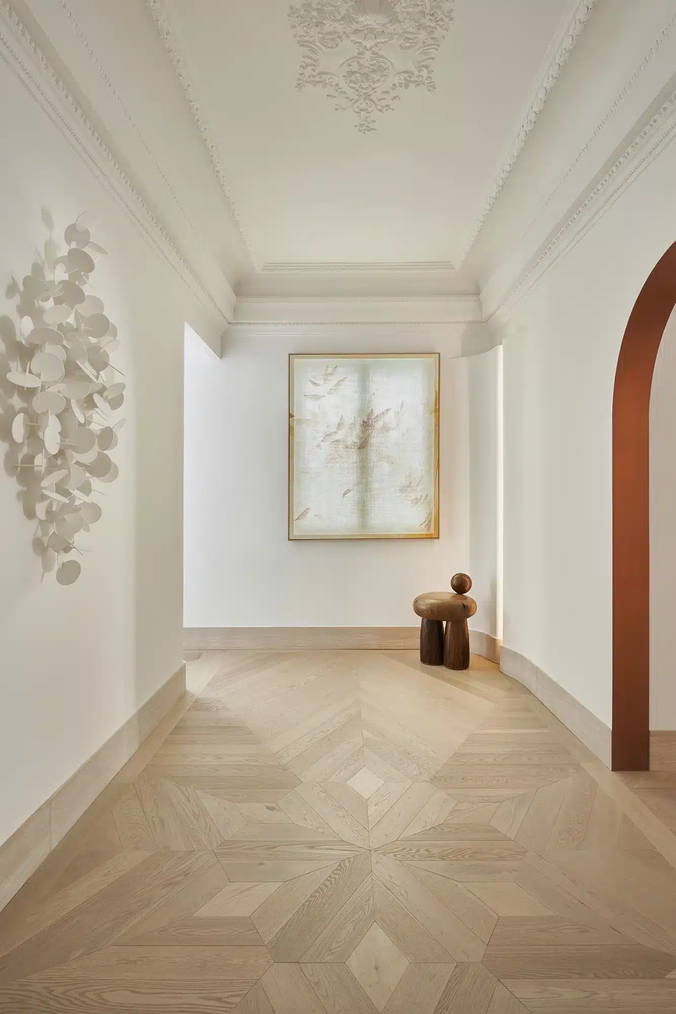 “Emoción Contenida. El “menos es más” también tiene su lado apasionante, como demuestra la reforma de este piso en el barrio señorial de Salamanca, en Madrid. Zinc Arquitectos trae al presente lo mejor del pasado acudiendo a los materiales nobles, las formas sinuosas y los colores terrosos”